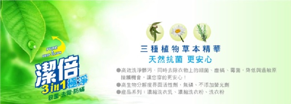 | | 潔倍極淨草本洗衣乳 | | 規格:1800gm | | ◎極淨配方,添加尤加利、迷迭香、洋甘菊複合精油,能高 效洗淨衣物髒污,同時去除衣物上的細菌、塵蹣、霉菌, 降低與過敏原接觸機會,三效合一,讓您穿的更安心!倍極 淨草本洗衣乳 | | ◎採用高生物分解度界面活性劑,無磷、不添加螢光劑。 | | ◎產品型式:補充包 | |  | | 潔倍極淨草本洗衣乳 | | 規格:3500gm | | ◎極淨配方,添加尤加利、迷迭香、洋甘菊複合精油,能高 效洗淨衣物髒污,同時去除衣物上的細菌、塵蹣、霉菌, 降低與過敏原接觸機會,三效合一,讓您穿的更安心!倍極 淨草本洗衣乳 | | ◎採用高生物分解度界面活性劑,無磷、不添加螢光劑。 | | ◎產品型式:瓶裝 | |  | | 潔倍極淨草本洗衣粉 | | 規格:1.5kg | | ◎極淨配方,添加尤加利、迷迭香、洋甘菊複合精油,能高 效洗淨衣物髒污,同時去除衣物上的細菌、塵蹣、霉菌, 降低與過敏原接觸機會,三效合一,讓您穿的更安心!倍極 淨草本洗衣乳 | | ◎採用高生物分解度界面活性劑,無磷、不添加螢光劑。 | | ◎產品型式:盒裝 | |  | | 潔倍極淨草本洗衣粉 | | 規格:2.0kg | | ◎極淨配方,添加尤加利、迷迭香、洋甘菊複合精油,能高 效洗淨衣物髒污,同時去除衣物上的細菌、塵蹣、霉菌, 降低與過敏原接觸機會,三效合一,讓您穿的更安心!倍極 淨草本洗衣乳 | | ◎採用高生物分解度界面活性劑,無磷、不添加螢光劑。 | | ◎產品型式:補充包 | |  | | 潔倍極淨草本洗衣粉 | | 規格:4.5kg | | ◎極淨配方,添加尤加利、迷迭香、洋甘菊複合精油,能高 效洗淨衣物髒污,同時去除衣物上的細菌、塵蹣、霉菌, 降低與過敏原接觸機會,三效合一,讓您穿的更安心!倍極 淨草本洗衣乳 | | ◎採用高生物分解度界面活性劑,無磷、不添加螢光劑。 | | ◎產品型式:袋裝 | |  |  | | 潔倍極淨草本洗衣乳 | | 規格:1800gm | | ◎護纖配方,添加尤加利、迷迭香、洋甘菊複合精油,高效 洗淨髒污,同時去除衣物上的細菌與柔軟衣物纖維,洗去 暗沉讓顏色更鮮豔,保護您心愛衣物,讓您穿的更出色! | | ◎採用高生物分解度界面活性劑,無磷、不添加螢光劑。 | | ◎產品型式:補充包 | |  | | 潔倍極淨草本洗衣乳 | | 規格:3500gm | | ◎護纖配方,添加尤加利、迷迭香、洋甘菊複合精油,高效 洗淨髒污,同時去除衣物上的細菌與柔軟衣物纖維,洗去 暗沉讓顏色更鮮豔,保護您心愛衣物,讓您穿的更出色! | | ◎採用高生物分解度界面活性劑,無磷、不添加螢光劑。 | | ◎產品型式:瓶裝 | |  | | 潔倍極淨草本洗衣粉 | | 規格:1.5kg | | ◎護纖配方,添加尤加利、迷迭香、洋甘菊複合精油,高效 洗淨髒污,同時去除衣物上的細菌與柔軟衣物纖維,洗去 暗沉讓顏色更鮮豔,保護您心愛衣物,讓您穿的更出色! | | ◎採用高生物分解度界面活性劑,無磷、不添加螢光劑。 | | ◎產品型式:盒裝 | |  | | 潔倍極淨草本洗衣粉 | | 規格:2.0kg | | ◎護纖配方,添加尤加利、迷迭香、洋甘菊複合精油,高效 洗淨髒污,同時去除衣物上的細菌與柔軟衣物纖維,洗去 暗沉讓顏色更鮮豔,保護您心愛衣物,讓您穿的更出色! | | ◎採用高生物分解度界面活性劑,無磷、不添加螢光劑。 | | ◎產品型式:補充包 | |  | | 潔倍極淨草本洗衣粉 | | 規格:4.5kg | | ◎護纖配方,添加尤加利、迷迭香、洋甘菊複合精油,高效 洗淨髒污,同時去除衣物上的細菌與柔軟衣物纖維,洗去 暗沉讓顏色更鮮豔,保護您心愛衣物,讓您穿的更出色! | | ◎採用高生物分解度界面活性劑,無磷、不添加螢光劑。 | | ◎產品型式:袋裝 | | |