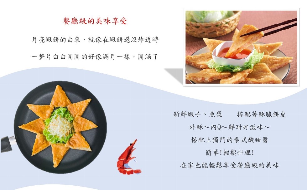 ★ 內餡製作真材實料 ★嚴選最新鮮的食材,為的就是滿足饕客們吃下肚的滿臉喜悅,一口接著一口。加入70%新鮮蝦漿和30%魚漿製作而成的月亮蝦餅,口感滋味都呈現出讓人難以忘懷的大海鮮味,就算到了緊縮的月底,小資、老饕們仍然難逃它的魅力啊!