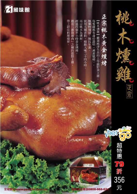 | ‧每一合購或立即訂購總份數需滿5份以上,享有ihergo團購特惠79折! ‧超特惠活動期間:2010/04/01~04/25 ‧兌換期間:2010/04/01~04/30 ‧主購開團時請限定單一門市地點,成團後請團員憑合購碼,個別到該門市享用,並現場付款。 ‧桃木燻雞為禮盒銷售,若需於現場用餐或餐廳協助烘烤, 請於到店前24小時以電話通知餐廳,以便餐廳提前準備。 桃木燻雞-獨家優惠79折!! 左營、板橋新開幕~全省同歡慶!!! 全省門市~獨家超特惠79折!!! 桃木燻雞:正宗‧純淨‧嚴選!!!  核桃木: (Hickor)成材期約50年以上至數百年,分布於美國中部與東岸, 木質細膩邊材呈白色至淡褐色,是各大飯店名廚愛用之燻材。 燻製: 將樹幹鋸短、晾乾,放在特製的烤爐裡慢慢燃燒, 讓食物有股很個別的甘、甜、香的煙燻風味,烘烤出爐後皮色金黃酥脆, 香氣四溢的人堅絕佳美味! 鹿野嫩黃土雞: 選台東鹿野土雞,每一雞隻都有身分證明,絕無藥殘留,無抗生素、荷爾蒙, 皮黃肉甘,肉質無腥有「霜降雞肉」之稱。 淨重:1.1kg 熱量:2487大卡 外帶保存期限:-18℃冷凍保存12個月