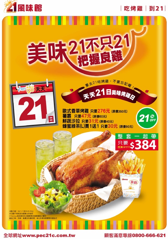*若需於現場用餐或餐廳協助烘烤,請於到店前24小時以電話通知餐廳,以便餐廳提前準備。 21日明星商品(歐式香草烤雞、薯霸、鮮蔬沙拉、蜂蜜綠茶L 2杯) 天天79折!!! 天天 21日~天天 79折!!!!  |