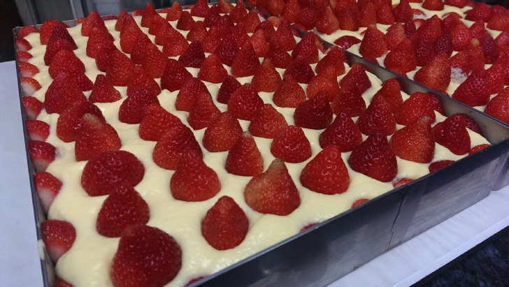 再組合一層法式杏仁蛋糕,最後蛋糕表面再鋪上一層新鮮草莓