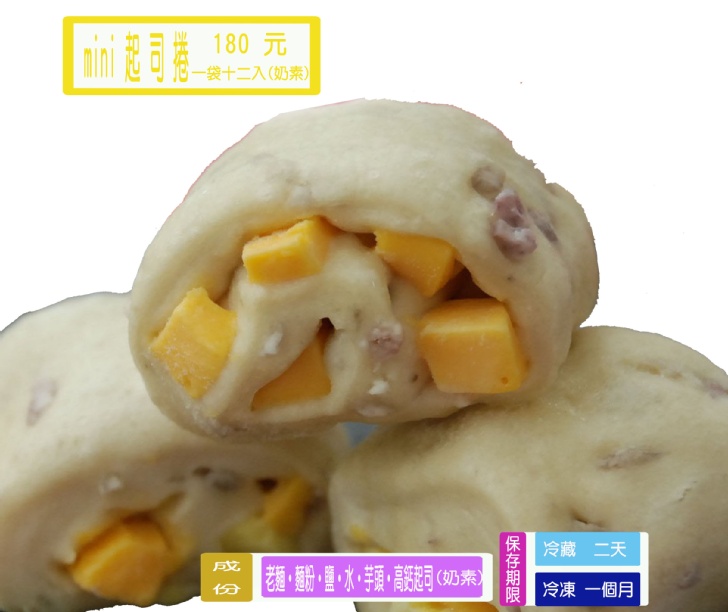 mini起司捲 -> 老麵、麵粉、水、糖、高鈣乳酪丁、芋頭