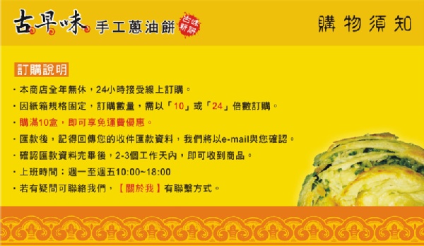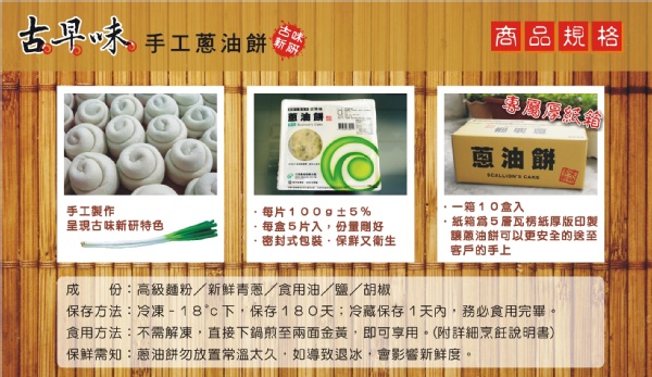 | | | | 團友許願團~想吃這家的古早味啦 這家的口味也很不錯喔~ ~~~~~~~~~~    | | 「古早味蔥油餅」 堅持整顆青蔥製作之外,直接採用契約耕作與專職蔥農供應有效控制管理青蔥原料品質,在青蔥任何部位均有其營養成份,蔥白部份富含蘋果酸,經耐炸油烹飪後分子變化,自然產生香味甜美的重要原因。 堅持提倡品嚐青蔥原味,衛生合格品管製程,採急速冷凍包裝封存法所以不添加任何防腐劑及人工香料 ,請安心使用。