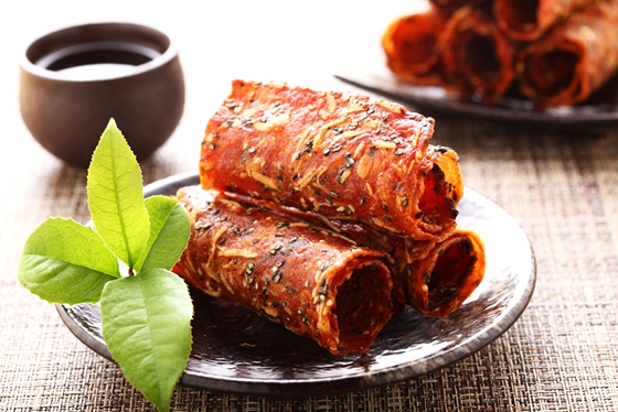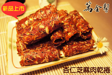 爽脆的肉乾捲,一口咬下「喀滋喀滋」好順口!事先炒香的杏仁和芝麻,在燒烤過的肉乾上,一起傳來濃郁的撲鼻香,媲美餅乾的酥脆口感十分有嚼勁,令人看了口水直流。