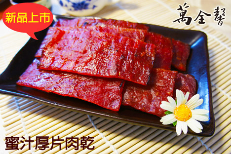 以私房蜜汁醃製烘烤,打造甘甜不膩的明星口味,外表油亮有光澤的蜜汁肉乾,一出爐便散發著強烈的炭烤香氣,讓人遠遠就忍不住聞香而來。