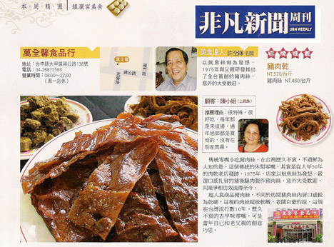 創立於1952年,至今已超過60年,三代傳承的堅持「要做,就要做最好!」創始人許清魁先生對產品原料、衛生和品質嚴格控管,堅持用新鮮活體豬肉做出品質優良肉類食品,這份堅持延續至今始終不變。大甲【萬全馨】肉品聞名全台,是許多遊客到大甲必買的伴手禮,祖傳秘方調配肉角,塊塊實在、彈性十足,口感濃郁是遊客不可錯過的好滋味!