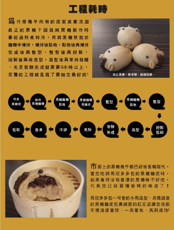 NEW!馬年到,特別推薦馬尼多多紅豆包,純正黑糖外衣QQ有彈性,搭配紅豆內餡甜而不膩口,馬年特殊造型祝福您Money多多,馬年行大運。