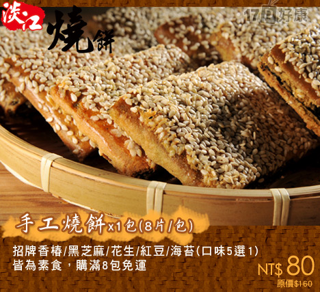 宅配:只要80元即可帶回【淡江燒餅舖】原價160元手工燒餅一包(8片):招牌香椿/黑芝麻/花生/紅豆/海苔(口味5選1),皆為素食,購滿8包免運!