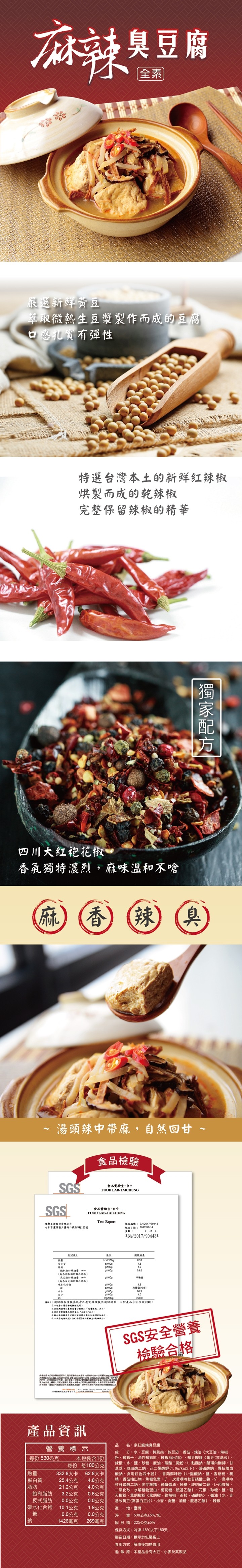 主要成分:水、豆腐、榨菜絲、乾豆皮、香菇、辣油、辣豆瓣醬、香菇鮮味粉、花椒、砂糖、鹽、朝天椒粉、黑胡椒粉、醬油、辣椒