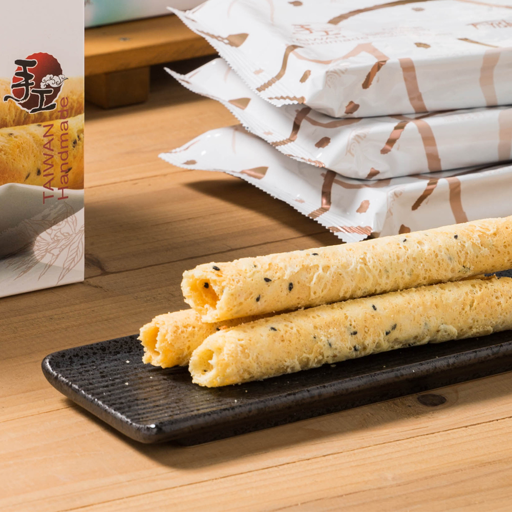 名:手工芝麻蛋捲(葷食)主成分:雞蛋、麵粉、砂糖、豬油、奶油、芝麻、奶粉、海鹽。注意事項:※本產品所標示之反式脂肪非油脂氫化而成。※本產品含牛奶、蛋、芝麻、含麩質的穀類製品,可能導致過敏症狀。※本產品生產線亦生產含堅果類、大豆製品,可能導致過敏症狀。