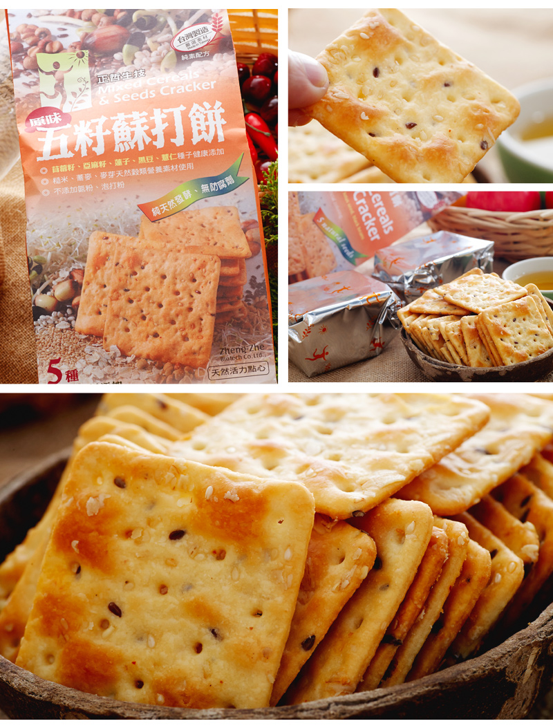 NEW!五籽蘇打餅(奶素配方)純天然小麥健康烘焙、添加苜蓿籽、亞麻籽、蓮子、薏仁、黑豆五種養生素材,並以義式香草、蕎麥、糙米、黃豆、燕麥與白芝麻等天然食材增加美味,純天然發酵,不使用化學膨鬆劑,口感更天然美味酥脆,不油膩少負擔,