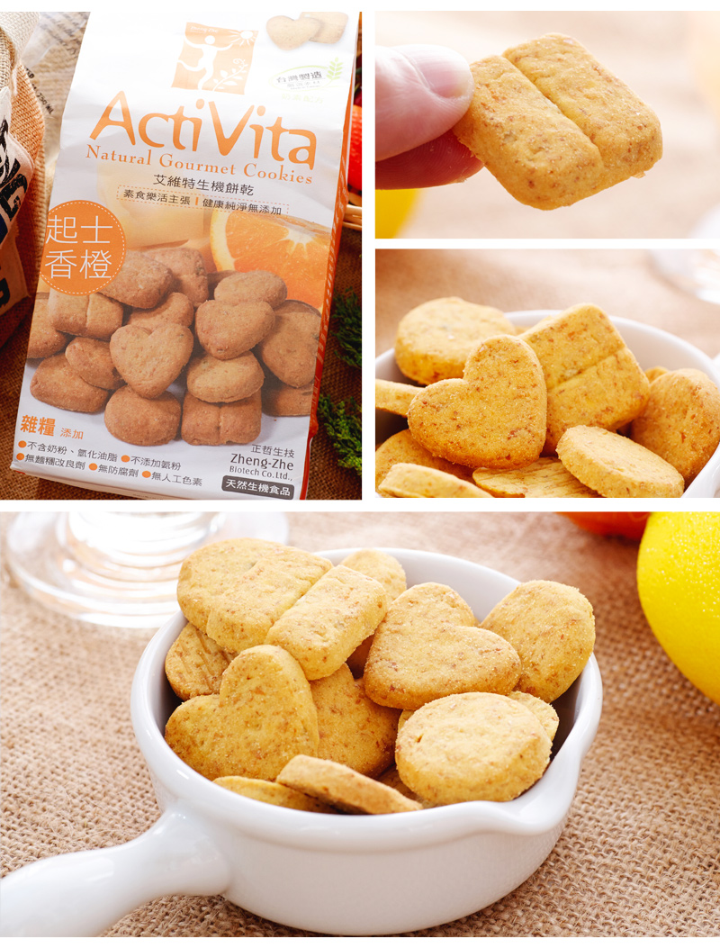 NEW!艾維特生機餅乾 - 起士香橙(奶素配方) 以小麥麵粉與比利時天然乳酪攪拌作成基礎麵糰,加入杏仁、南瓜子、燕麥片等養生食材,再以香橙提味,味覺層次豐厚濃郁,清新爽口不油不膩,風味更上一層,艾維特創新食感的美味點心,讓您輕鬆享用,健康無負擔。
