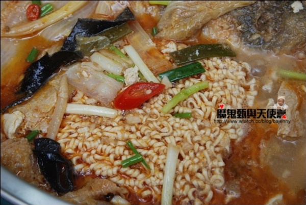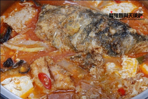 煮法很簡單,沙鍋菜退冰後,小火煮沸,加入魚頭和魚肉,即可上桌。沙鍋菜原本就有許多火鍋料,白菜、嫩豆腐、金針、黑木耳和豆皮,還有少許薄肉片,其中的白菜軟爛鮮甜,豆腐口感超嫩,豆皮超吸汁入味,肉片仍保有口感。湯頭是大骨濃湯加沙茶、蒜頭、辣椒和花生粉調味,看起來很辣,吃起來幾乎完全不辣~~