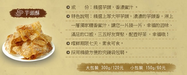 精選上等芋頭,濃濃的芋頭香,淋上一層獨家糖香蜜汁,讓您一片接一片,幸福的滋味、滿足的口感,三五好友齊聚配壺好茶,幸福喔!