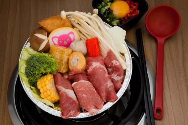 豚骨高湯、高麗菜、花椰菜、玉米、香菇、金針菇、杏包菇、油豆腐、豆皮、魚板、魚餃、蛋餃、蟹肉棒、蟹腳丸、貢丸、鮮蝦、羊肉片、冬粉、沙茶沾醬。(火鍋料將不定期更改)
