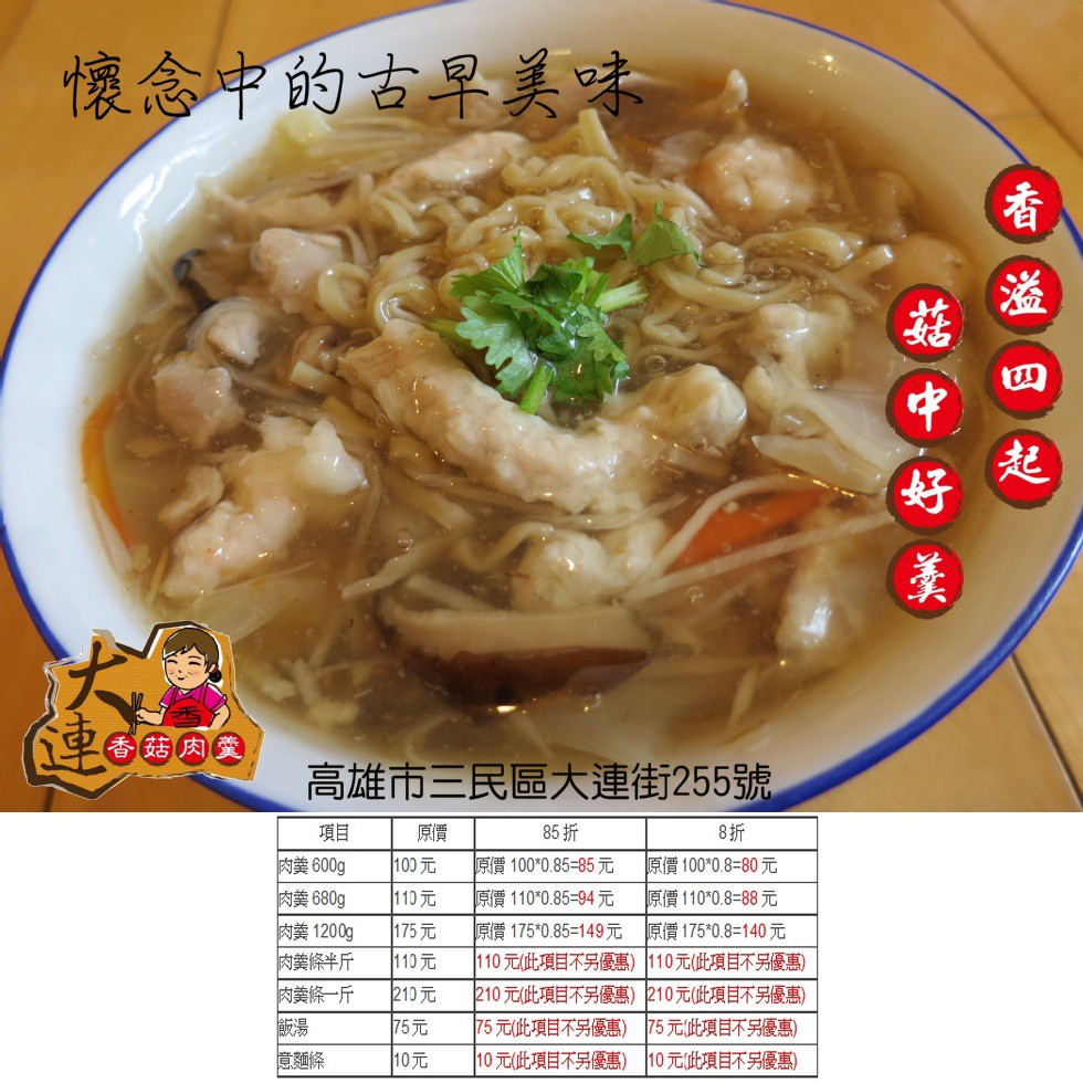 好康優惠 肉羹 全面85折!!!網頁上的價格已是打85折的價錢喔~  | 大連香菇肉羹