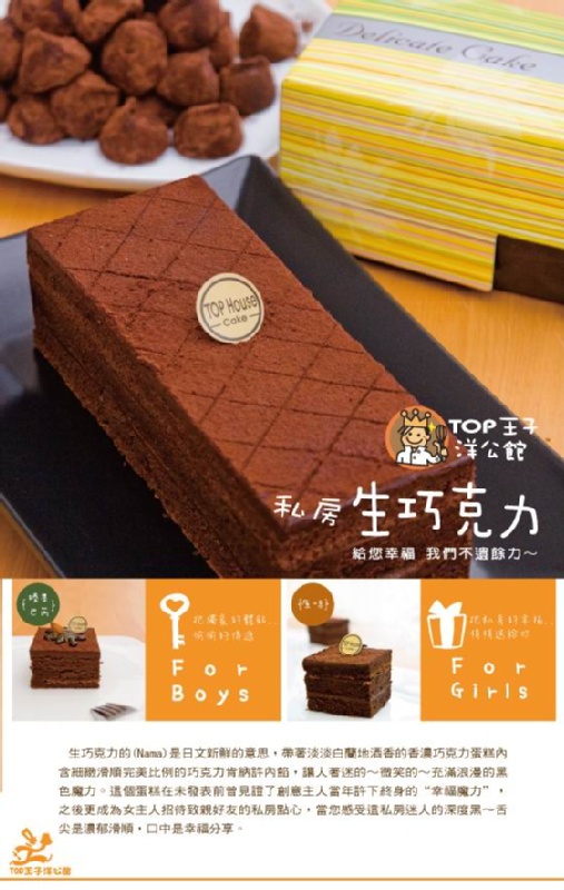生巧克力中的(Nama)是日文新鮮的意思,帶著淡淡白蘭地酒香的香濃巧克力蛋糕內含細緻滑順完美比例的巧克力肯納許內餡,讓人著迷的~微笑的~充滿浪漫的黑色魔力,這個蛋糕未發表前曾見證了創意主人當年許下終身的”幸福約定”,之後更成為女主人招待摯親好友的私房點心,當您感受這私房迷人的深度黑~舌尖是濃郁滑順,口中是幸福分享。二種口味,原味for Girl,榛果巴芮for Man