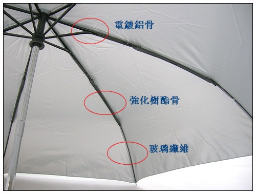 傘骨為電鍍鋁骨、中段黑色強化樹酯骨、尾段 玻璃纖維傘骨