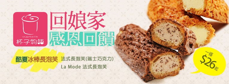 杯子物語回娘家---感恩回饋採用高級香草籽製成的香草卡仕達餡,入口時濃郁的香草奶油味,冷凍過後更有著酷似冰淇淋的口感,不甜不膩,絕對能滿足您的味蕾!每一合購或立即訂購總訂購份數需滿15份(不需為倍數),就能享有大合購特惠及免運費;如訂購總份數未滿15份,需自行負擔運費210元。*單筆訂購總份數滿15份,贈送主購禮 大合購商品【法式長泡芙】一盒網友推薦:http://blog.roodo.com/kayu/archives/19277380.htmlhttp://goo.gl/EDOmDhttp://goo.gl/U3wEFhttp://goo.gl/Q182mhttp://goo.gl/jxpnHhttp://mypaper.pchome.com.tw/chillywu/post/1322292494