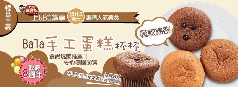 免雜[大合購至3/18止]Bala蛋糕杯杯~幸福下午茶/輕食首選,全程手工烘製使蛋糕口感鬆軟綿密,不乾不油膩,減糖減油,不添加任何化學香料及防腐劑!滿19份的倍數免運