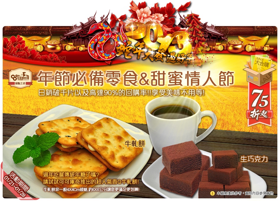 *本檔大合購最後到貨日為:2/6為避免年節將近宅配送貨量激增導致配送時間延遲,請各主購自行拿捏緩衝時間,以免影響發貨!(為方便店長接單生產出貨,先完款先排單先出貨,務必完款後安排再約定到貨喔!)年節必備零食&甜蜜情人節過年吃膩傳統年糖了嗎?請試試可可庫奇推出的超人氣香Q牛軋餅日銷破千片以及高達90%的回購率!!享受美味不用等每一合購或立即訂購,總訂購金額需滿2000元(不需為倍數),就能享有大合購特惠及免運費;如訂購總金額未滿2000元,需自行負擔運費150元。*單筆訂購總金額滿2000元送皇家伯爵生巧克力或綜合牛軋餅x1【網友推薦】用小叉子插起一塊生巧!!!!哇嗚!!!!!你看這個巧克力的厚度用看的就很流口水了http://www.ptt.cc/bbs/Snacks/M.1312439614.A.7C0.html臉上充滿的盡是那無法言譽的幸福和滿滿的感動http://tw.myblog.yahoo.com/alrena1234/article?mid=1697&l=d&fid=13