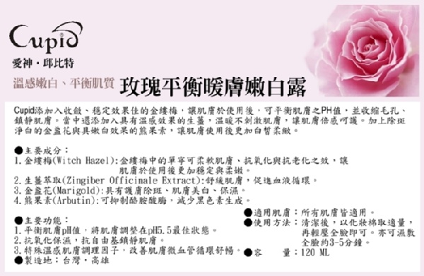 Cupid添加入收斂、穩定效果佳的金縷梅,讓肌膚於使用後,可平衡肌膚之PH值,並收縮毛孔、鎮靜肌膚。當中還添加入具有溫感效果的生薑,溫暖不刺激肌膚,讓肌膚倍感呵護。加上除斑淨白的金盞花與具嫩白效果的熊果素,讓肌膚使用後更加白皙柔致。