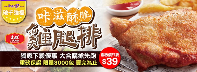 大成咔滋酥脆雞腿排,獨家下殺優惠搶先跑,重磅保證每片重達210克以上,一片只要39元!限量3000包,速度太慢就搶不到啦!