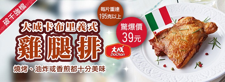 單筆訂單份數滿60包,主購禮送卡布里義式燒烤雞腿排1包(價值39元)(可倍數累計)