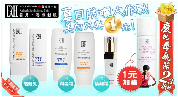 ●ERH 保濕防曬隔離乳SPF30★★★ 噴霧型Spray(市價:1080元 / 瓶) 大合購優惠:1元加購 / 瓶●ERH 保濕防曬隔離乳SPF30★★★(膚色、白色)(市價:880元 / 瓶) 大合購優惠:610元 / 瓶●ERH 極緻防曬隔離潤色霜SPF50+/★★★(膚色、白色)(市價:980元 / 瓶) 大合購優惠:650元 / 瓶●ERH 透皙明亮喚采隔離霜(明亮)(市價:1280元 / 罐)大合購優惠:960元 / 罐