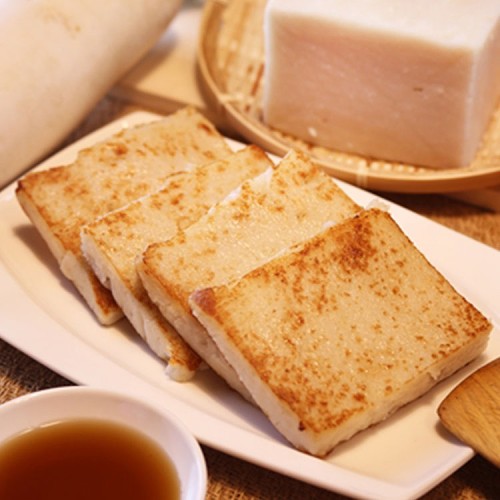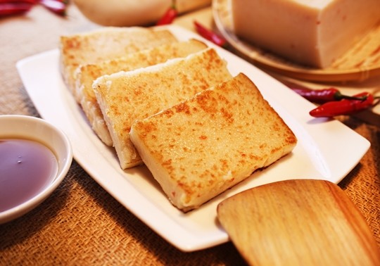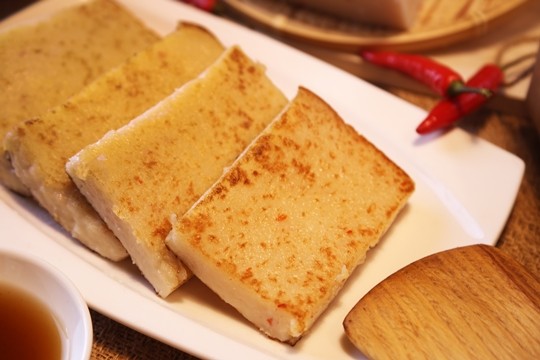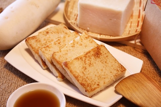 將菜頭粿加入新鮮芋頭、採用附近農夫所栽種得現採蘿蔔,因此有特濃蘿蔔及芋頭香氣