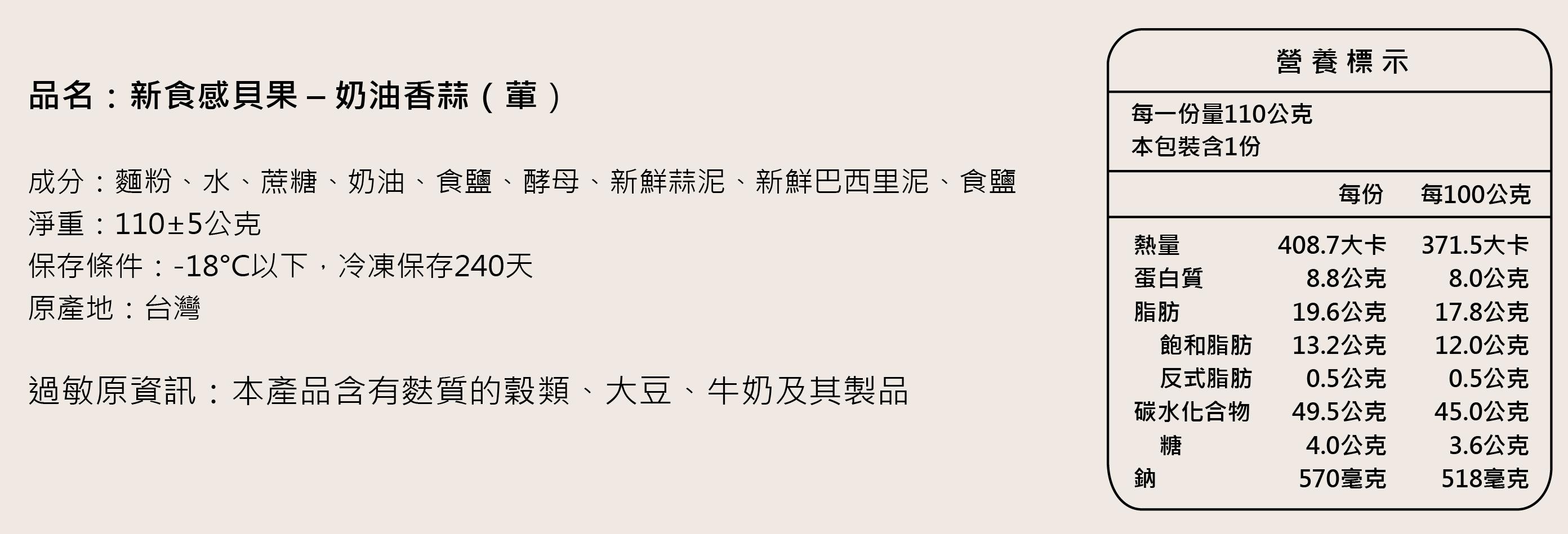 過敏原資訊:本產品含有麩質的穀類、大豆、牛奶及其製品