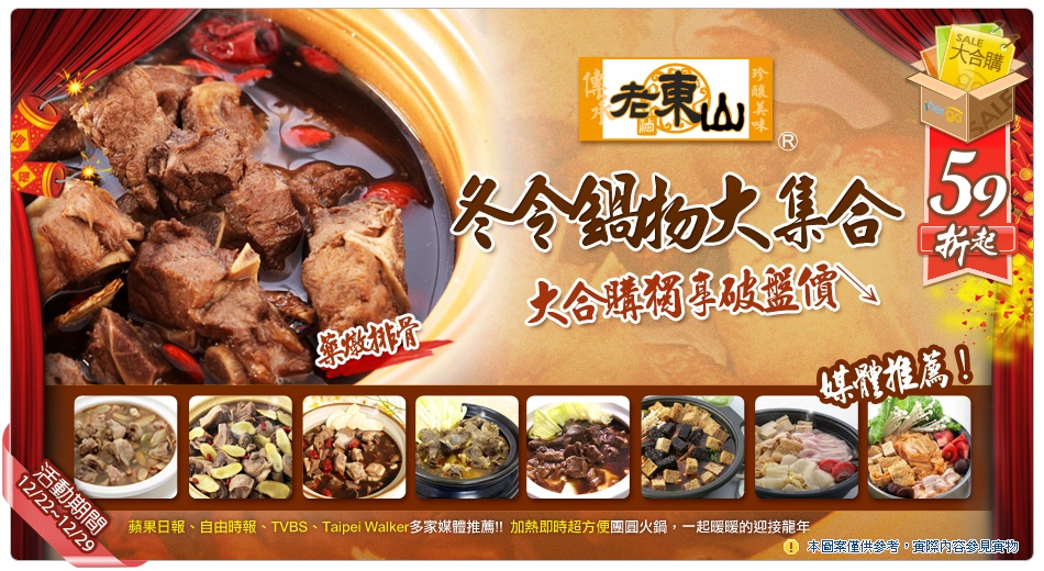 【老東山火鍋湯底,優惠價獻給大合購!】冬令鍋物大集合~九種口味任你挑選只要加熱就可以享受暖呼呼的一餐囉每一合購或立即訂購(含點數折扣)總訂購份數需滿12份(不需為倍數),就能享有大合購特惠及免運費;如訂購總份數未滿12份,需自行負擔運費150元。*單筆訂購總份數滿24份 贈送主購禮 大合購商品(任選一包)(可倍數累積)