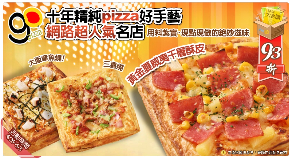 單筆訂單達180片以上可以先幫忙分裝好呦^__^千層披薩調理方式:第一種微波加烤箱調理方式 步驟1 微波解凍: 若是冷凍狀態微波約1分鐘(噴灑一點點水或放一杯水防止太乾) 冷藏狀態微波約30秒即可(噴灑一點點水或放一杯水防止太乾) 步驟2 用烤箱調理: 解凍後放進烤箱,底部可放盤子或是鋁箔紙以防底部過焦 烤約3-5分鐘(以不烤焦為原則)第二種微波調理方式 調理時先噴灑一些水或放一杯水防止太乾,冷凍調理時間約2-3分鐘目視乳酪絲微冒泡即可 冷藏調理時間約1-2分鐘第三種烤箱調理方式 烤箱調理時間冷凍狀態需先等它退冰回至常溫,底部可放盤子或是鋁箔紙以防底部過焦 以不過焦為原則約3-5分鐘 冷藏狀態可直接烤 享用千層時可搭配調味乳或是果汁!!! ~ 就 ♥ 現點現做的好味道 ~3天熱銷8000片,網路超人氣pizza名店用料大方,濃郁乳酪絲搭配火腿等精選好料簡單步驟輕鬆料理,懶人美食最佳首選!◎為響應環保,本檔大合購不主動提供塑膠袋喔!(若需要則下訂單時再特別跟店家提出!!)每一合購或立即訂購,總訂購份數需滿90份(不需為倍數),就能享有大合購特惠及免運費;如訂購總份數未滿90份,需自行負擔運費220元。*滿90份 每30份贈送主購禮1片 (口味任選)【網友推薦】好吃的GO PIZZA夠披薩~便宜也有好味道呢!http://www.wretch.cc/blog/hsuan730619/11480617來拚經濟----gopizza真的夠披薩http://tw.myblog.yahoo.com/jw!3DWpKgCVHw7s4JU3hg1vAg--/article?mid=10068GOPIZZA 夠披薩 - 經典 6 吋手作披薩http://tw.myblog.yahoo.com/s-neok/article?mid=6503&prev=-1&next=6500GOPIZZA-夠披薩http://tw.myblog.yahoo.com/jw!cgGT5aCRGRmEjaTUxdcJOI.7/article?mid=1869*本檔大合購最後到貨日為:5/24(為方便店長接單生產出貨,先完款先排單先出貨,務必完款後安排再約定到貨喔!)