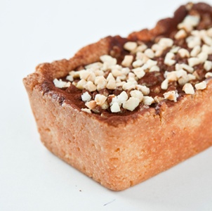 酥脆如餅乾一般的脆皮塔,封上手工生巧克力, 再灑上香氣天然香醇的杏仁角,搭配由林鳳營鮮奶製成的烤布蕾,口感豐富多層次。