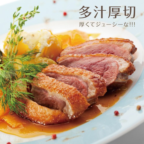 四、取用胸腹帶皮清肉保留鴨胸肉的美味完整,肉質鮮嫩扎實,多汁、甜潤、有彈性,無一般鴨肉的腥味,一口咬下肉香在嘴邊徘迴不已,更享有鴨肉中的菲力美譽.