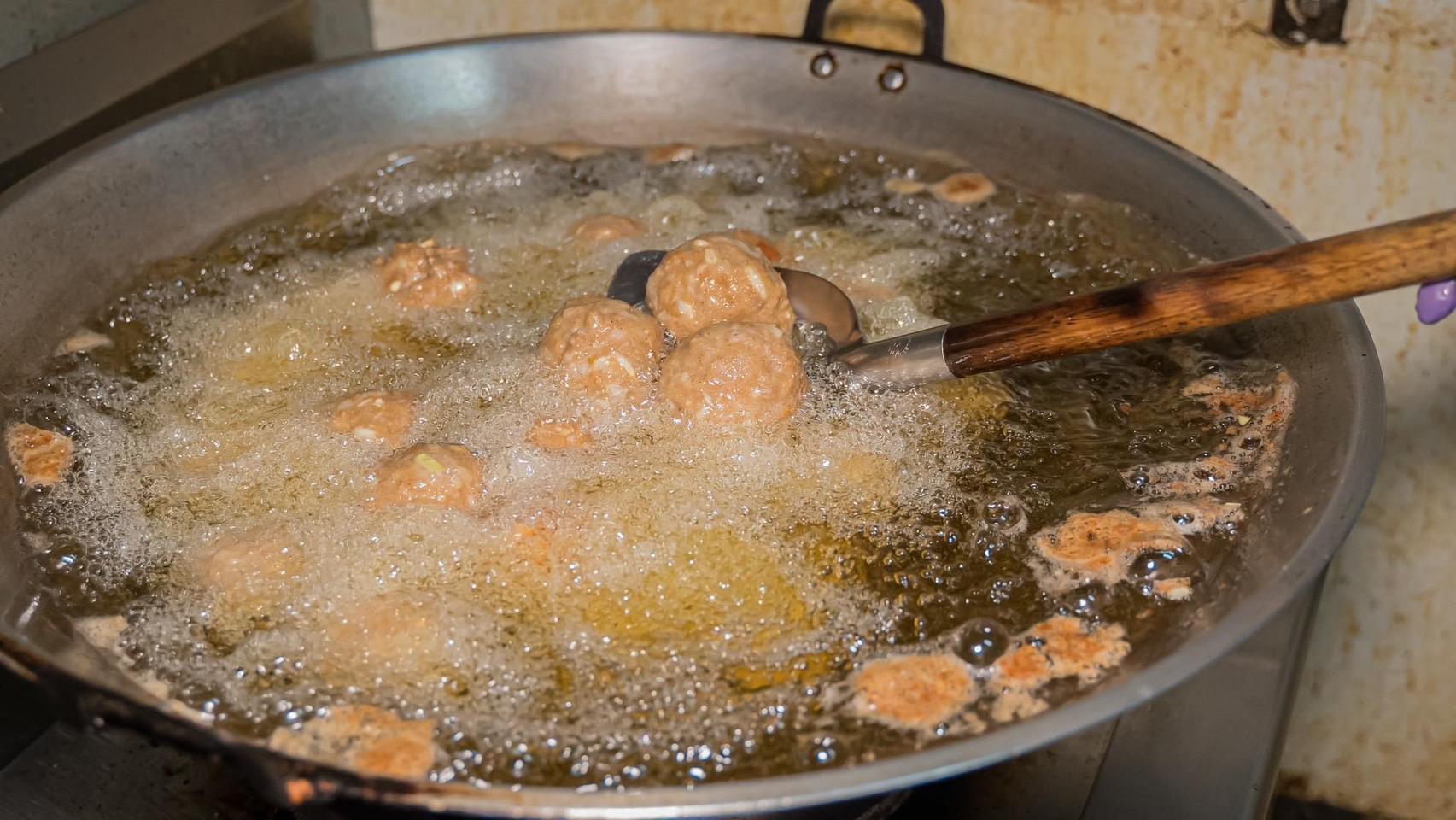 先腌過,再左右手來回拍打成形後再油炸(增加肉的扎實度)。最後再蒸30分鐘。