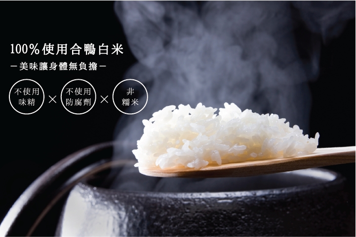 採用合鴨自然米與多種食材調理而成,香Q美味不油膩,本品【絕非糯米】做成,無食用糯米後有漲氣的問題,製造過程保証無添加任何防腐劑及人工味精,並經真空高溫殺菌,讓您吃的安心且無負擔。