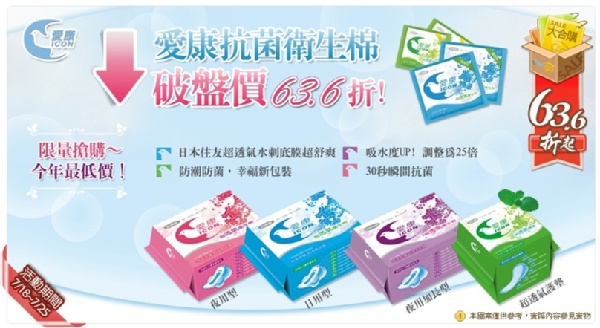 團購冠軍 愛康抗菌衛生棉~破盤價63.6折