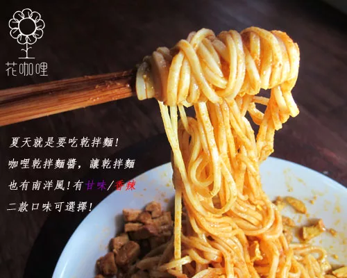 花蓮家咖哩推出全新手工南洋原味咖哩乾拌麵醬,總共有二款口味(香辣/甘味),花咖哩乾拌麵醬除了延續家咖哩的手工咖哩製作手法,以新鮮香料作成濃郁咖哩醬汁,搭配香氣十足的豆干和肉燥,大容量120g/包,家中存放的麵條煮開後輕易絞拌即成為絕對可以讓您一口接一口吃完的咖哩乾拌麵。