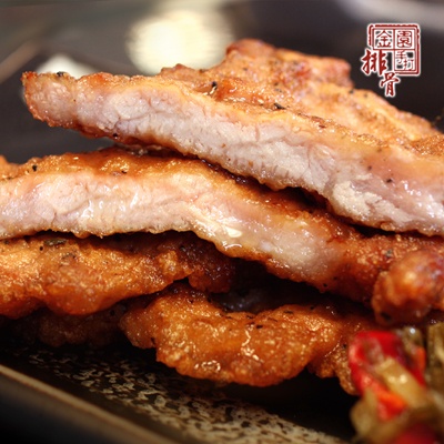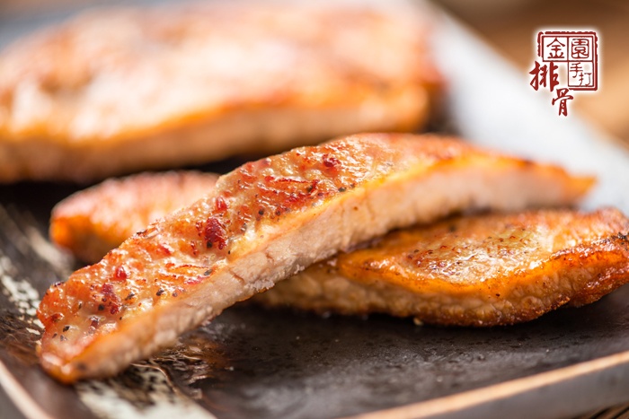 嚴選上等里肌肉,在醃製前會以手工進行捶打,使肉質軟嫩增加彈性,再加入金園的獨特配方調味,厚切的豬排在醃製過程中不易入味,因此每一片豬排都要以手工抓捏、拍打,反覆浸在醬料中,再以真空按摩機SPA五十分鐘,才能造就出這麼獨持口感的厚切手打豬排。