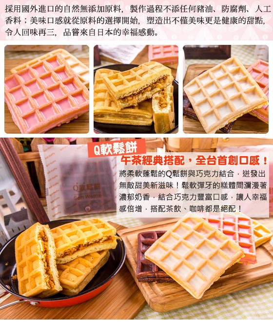 ❣ 主購團員好評不斷再上檔!上次沒買到,這次別再錯過!❣ 鬆餅界團購第一名,台中知名伴手禮,一期一會感動再現!❣ Q鬆餅與巧克力的完美搭配,全台首創口感!❣ 鬆餅與濃濃牛奶的完美搭配,幸福滋味絕對是下午茶點心的最佳首選!✚ 單筆訂單金額滿3000元即可免運,未滿3000元需自行支付運費270元。 (配送僅限台灣本島,離島訂購請寄信洽詢 謝謝!)* 最後付款期限為到貨日前6天,若超過活動時間沒付款,訂單視同失效。* 訂單處理天數約6天工作天(不含例假日)。* 為保障彼此權益,出貨順序與贈品皆以完成匯款者優先,未完成匯款前恕不預留到貨日喔 * 105年11月24日為本檔最後到貨日,無法展延 請見諒。主購確認到貨日可配合再進行下單
