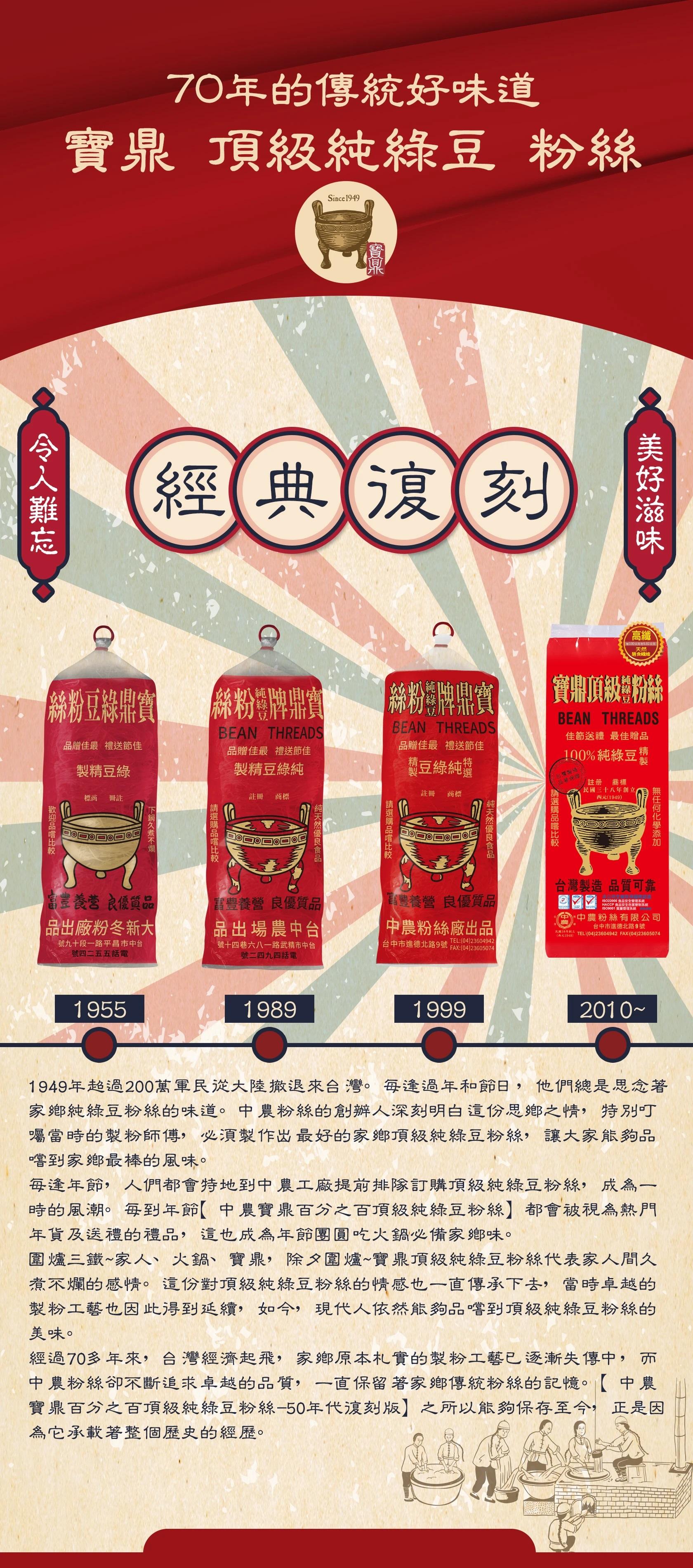 中農出品的寶鼎頂級純綠豆粉絲即是由純綠豆澱粉製成,精選泰國進口頂級大油綠豆,飄浮篩選淘汰率高達30%,經特殊生產技術並只取中段綠豆澱粉去頭尾精製。