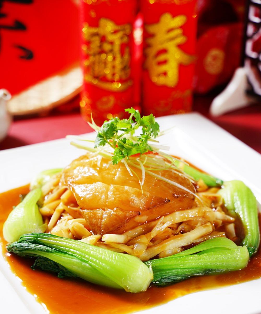 再佐以猴菇擺盤,淋上燒炙的蠔油醬汁、 圓圓滿滿的桌上好年味!