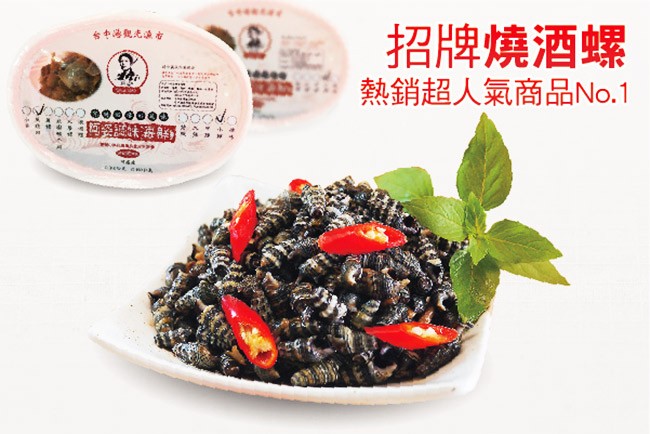 產品特色:燒酒螺原是海口邊大人的下酒菜,小孩子的零嘴。為何名叫燒酒螺呢?其來源於過去的日子,沿海一帶的人生活比較窮苦,在寒風凜冽的天氣要出海捕魚時,通常都要喝酒暖身,因當時物資缺乏沒什麼酒可下酒,而習慣煮「螺仔」來下酒,因此得名。