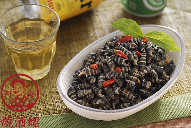 小時候燒酒螺是一種很普遍的零嘴。和阿公一道去看野台戲,阿公身邊總是會出現有一位賣燒酒螺的攤販,一部大又粗的的腳踏車後面擺著一簍佈滿醬油蒜香竹籃子,籃子裡蓋著一條白色棉布,白布裡面就是令人口水直流香辣四溢的燒酒螺。阿公知道「大人看戲看棚頂,囝仔看戲看棚腳」,身為小孩子的我們當然是很想擁有一小包吸起來美味無比的燒酒螺!那炒熱後的滋味真是凡人無法擋。阿姿調味海鮮就是要使這古今美味繼續傳承下去 。