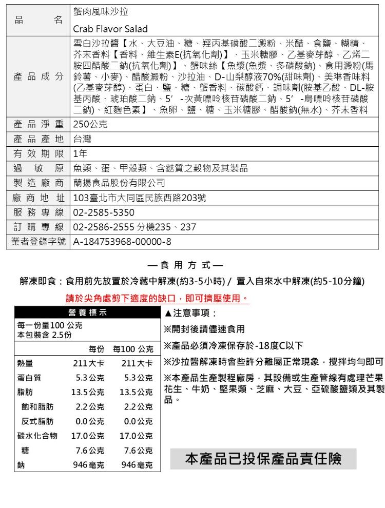產品特色:精選蟹味絲搭配滑潤沙拉醬,加入柳葉魚卵,雙重海鮮多層次之口感,點綴些許芥末風味,海鮮味與芥末香味相互呼應,交織出絕妙的風味,回味無窮。