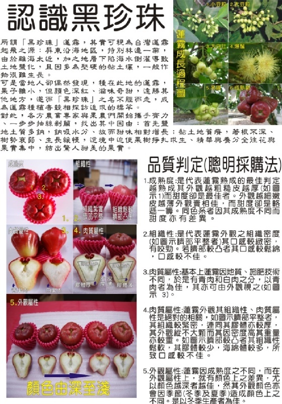 關於店家  蓮霧品種與種植差異 (1)先天條件: 「林邊黑珍珠」與「屏東蓮霧」,又是怎麼不同,最主要的是土壤屬性之不同。 林邊「黑珍珠」蓮霧之所以盛名,乃因受海水倒灌滲透內陸,使土地略帶鹽份,形成有利栽培蓮霧生長的特殊環境,致使東港到枋寮沿海一帶的蓮霧,果肉堅實多汁,香脆爽口甜美,若觀其果實外貌顏色,果皮呈深暗紅,光滑圓潤誘人,有如黑珍珠一般,因而取名為「黑珍珠」。 屏東蓮霧其生產地在內陸屬砂質土,絕不可能有帶著鹹份的海風吹來或海水湧來的,砂質土栽種的蓮霧,成熟後的果實質地真的遠不如鹹水埔土壤地,前者果實構成中的海綿質較多,脆度較差,果皮顏色與光澤也比較弱些。 (2)後天因素: 「什麼管理技術?最重要的就是自己要瞭解自己土地的狀況、樹叢 的狀況、配合氣候的狀況,種蓮霧不是固定一個公式⋯」。 蓋網催花的技法,將蓮霧樹體在開花期間原本分成三到五次慢慢吐放花朵的自然習性,變成一次就催逼出來,「完全是違反蓮霧生理週期的作法,簡直就像在抽取骨髓一樣」36。許多年前他們就認為,蓋網催花的蓮霧樹體會越來越弱,不僅果實品質深受拖累,久而久之還可能因為樹體衰弱而開始產生許多意料不到的疫病或蟲害。因而,他們堅持應該回復蓮霧本性(傳統自然開花),讓蓮霧樹體在最健壯的生理條件之下,產出最優良品質的黑珍珠蓮霧果實。 如何挑選黑珍珠蓮霧: 蓮霧品質、風味的高下,決定於四大要件,即甜度、多汁、脆爽、細膩,因此,當您在選購時,記得掌握住:「黑透紅、肚臍開、皮幼幼、粒頭飽」的四大原則。會吃蓮霧的人都知道,蓮霧要成長夠成熟,其果實的甜度才夠,成長愈成熟的蓮霧,就愈甜愈好吃。觀察蓮霧的成熟度,可注意觀察蓮霧果實上「臍」的部位,臍底黑的甜度高。蓮霧的臍部,有四片殘留的萼片,愈分開表示愈成熟,風味亦愈好。至於吃蓮霧時,千萬不能剖半,洗淨後要整顆咬著吃,咬出清脆聲響,且需從果蒂尖端咬起,再吃到臍的部位,愈吃愈甜,逐漸進入佳境,才能享受到蓮霧甜美的滋味。