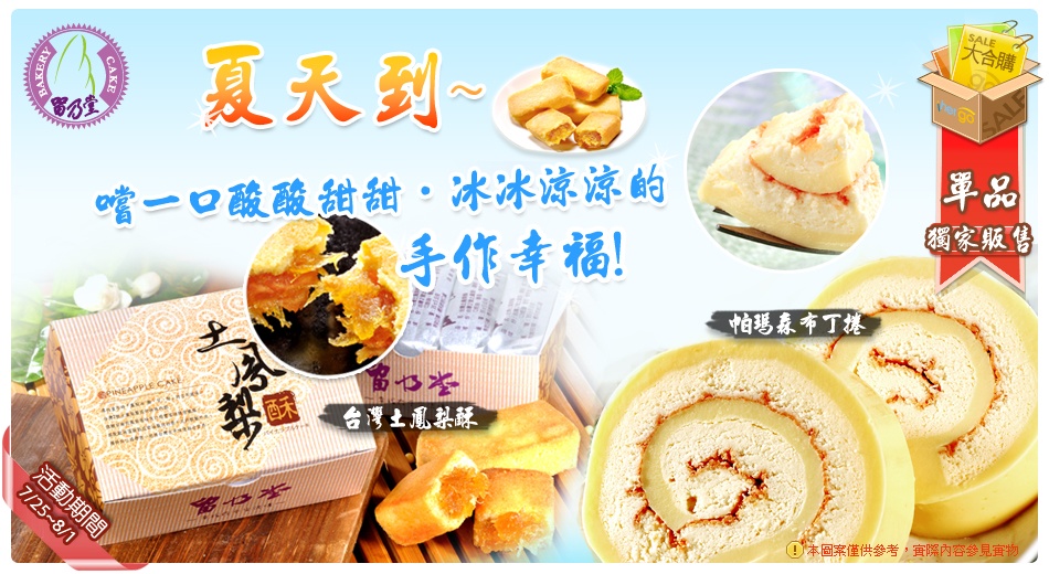 夏天就是要吃~冰冰的帕瑪森布丁捲♥*每一合購或立即訂購(含點數折扣)總金額需滿2000元,就能享有大合購特惠及免運費;如訂購總金額未滿2000元,需自行負擔運費190元*單筆訂購總金額滿3000 贈送主購禮 台灣土鳳梨酥(5入精緻盒)(市價150元)*網友推薦驚奇的清爽口感層次豐富:http://www.wretch.cc/blog/cat761006/26837256令人回味的自然微酸:http://www.wretch.cc/blog/paulyearkimo/1104675從沒想過布丁可以與起司結合:http://www.wretch.cc/blog/oldwu/234098清爽的布丁似乎在嘴裡跳探戈喔:http://www.wretch.cc/blog/wandababy/1656012嘴中盡是滿滿的奶油香及鳳梨的果香:http://www.wretch.cc/blog/yuki530tw/790430