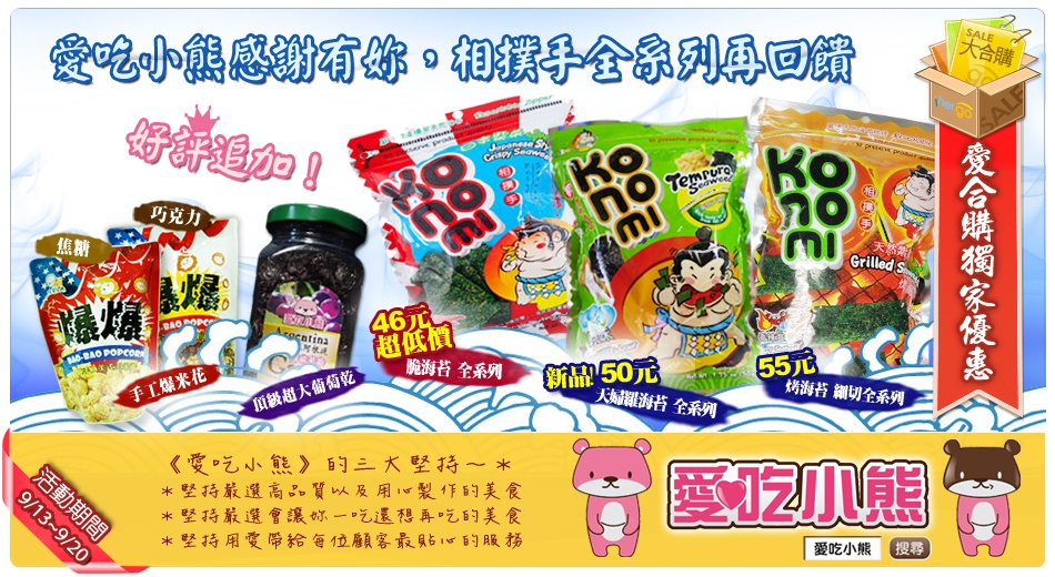 ♥愛吃小熊感謝有妳,相撲手&新品涮嘴零嘴大回饋!♥*每一合購或立即訂購(含點數折扣)總金額需滿2000元(不需為倍數),就能享有大合購特惠及免運費;如訂購總金額未滿2000元,需自行負擔運費80元。 *單筆訂購總金額滿2400元 贈送主購禮(二選一,可倍數累積)爆爆純手工美式玉米花【焦糖】 1份 KONOMI 相撲手-天婦羅海苔【原味】1份 (限量100包~*)*單筆訂購總金額滿4800元 贈送主購禮(可倍數累積)阿根廷頂級無籽葡萄乾 1份 【網友推薦】http://tw.myblog.yahoo.com/jw!7Oh2_VaXHRj_RtjksEd2/article?mid=25404http://nychen.pixnet.net/blog/post/26163537http://loshen.pixnet.net/blog/post/28043365加入愛吃小熊粉絲團:http://www.facebook.com/greedybears