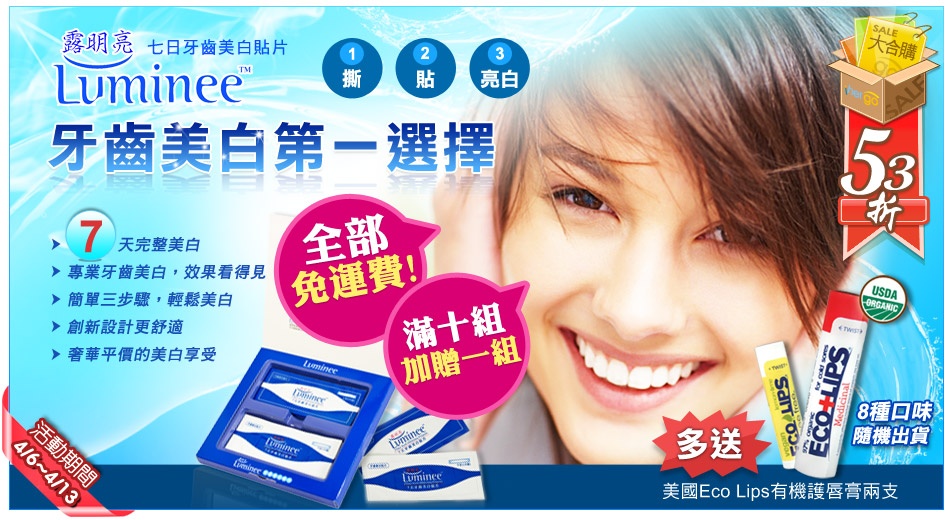 *單筆訂購總份數滿10組 贈送主購禮 露明亮七日牙齒美白貼片1組(市價1480元)(加贈美國Eco Lips有機護唇膏2支)(市價199元/條)(可倍數累積)
